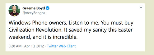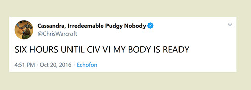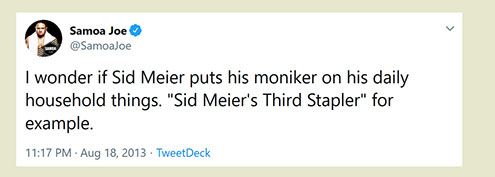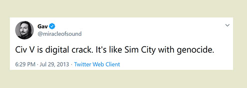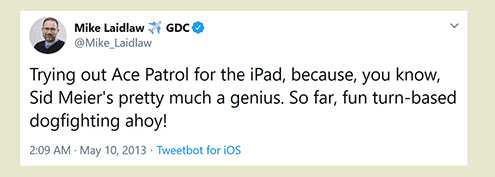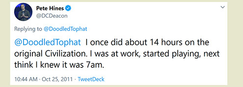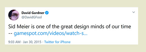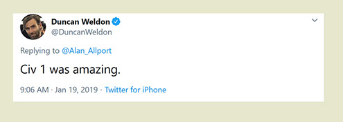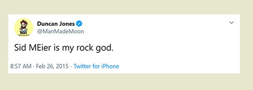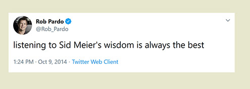 "Any game designer who tries to tell you that he hasn't taken anything away from a Sid Meier game is akin to a film director saying he has never watched a Hitchcock movie. For Sid is our Hitchcock, our Spielberg, our Ellington..."