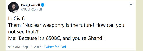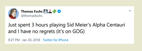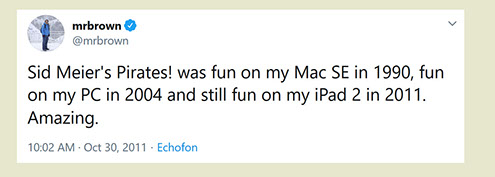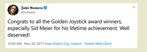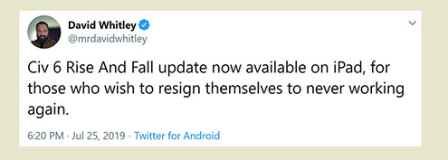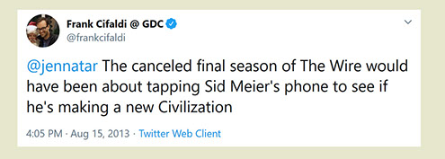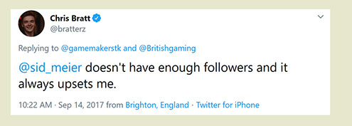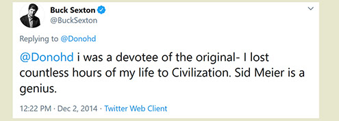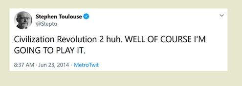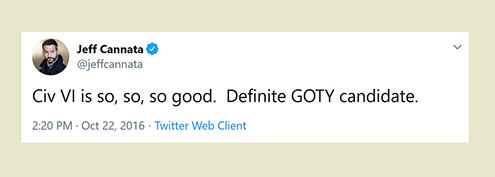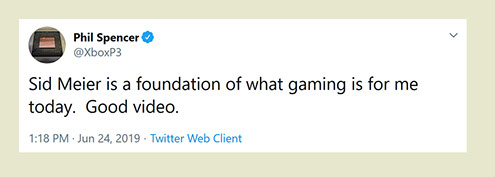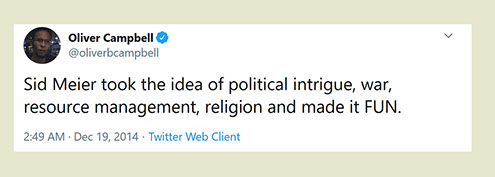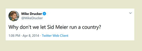 "Any game designer who tries to tell you that he hasn't taken anything away from a Sid Meier game is akin to a film director saying he has never watched a Hitchcock movie. For Sid is our Hitchcock, our Spielberg, our Ellington..."